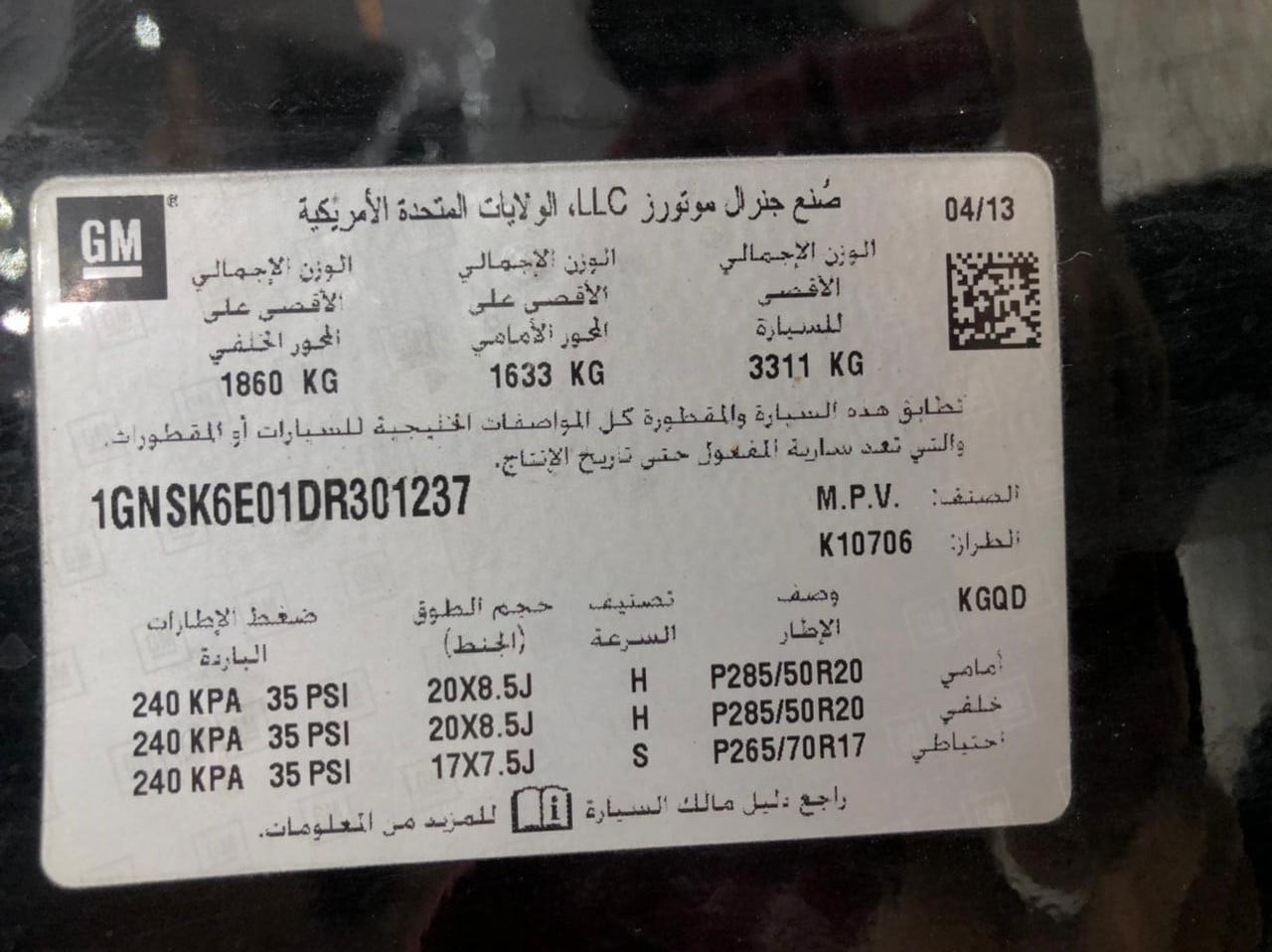 المركبة خليجية وكالة مكفولة حتى الدعاميات, المواصفـات, محرك 8 سلندر 5300 , ويل كب حجم 20 اصلي ,كروم مع طقم تاير جديد, سلايد روف قمارة, كشافات دعامية اصل, مع حساسات خلفية اصل, كاميرا خلفة اصل, يدات ابواب نيكل مع مرايا جانبية نيكل, مرايا جانبية شفط كهرباء , اشارات بالمرايا الجانبية , السيارة تشغيل عن بعد, باب خلفي كهربائي شفط, غرفة السيارة جلد بيجي اصل, تحكم كهربائي للمقاعد الامامية للطرفين, المقاعد الامامية تدفئة وتبريد كشن , ذاكرة كشن للسائق لوضعين , شاشة سقفية عارضة لل DVD ,